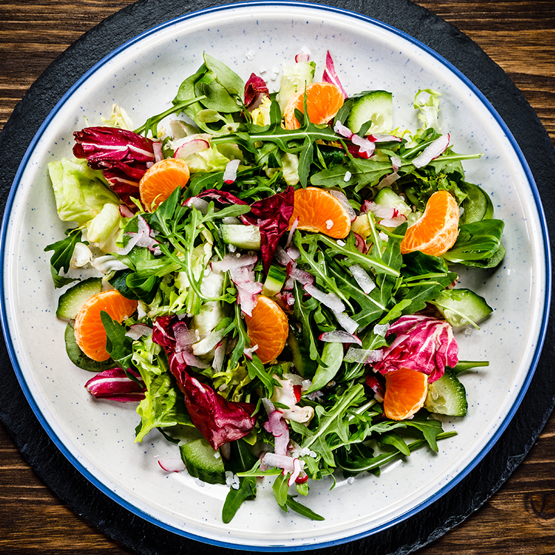 This salad is a mixture of spinach, romaine and iceberg lettuce with mandarin oranges, cucumbers, green onions, carrots, tomatoes, and topped with crumbled egg. There is no need to add dressing because it is served with a homemade garlic and herb or homemade Italian dressing.